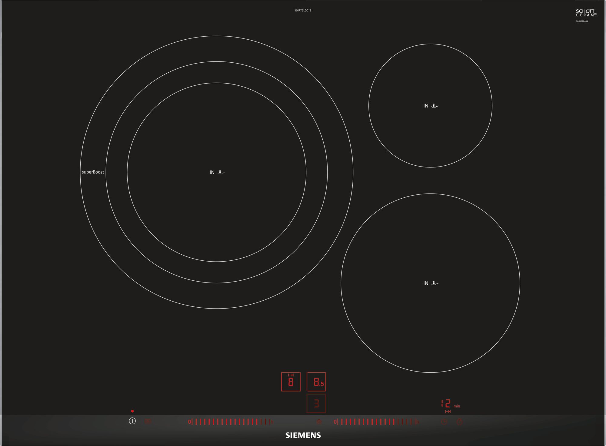 EH775LDC1E.,Placa de inducción de 70 cm de ancho..,Diseño topClass..,Color negro..,EAN: 4242003698044Control LightSlider con 17 niveles de potencia..,3 zonas de inducción con función Sprint y shor
