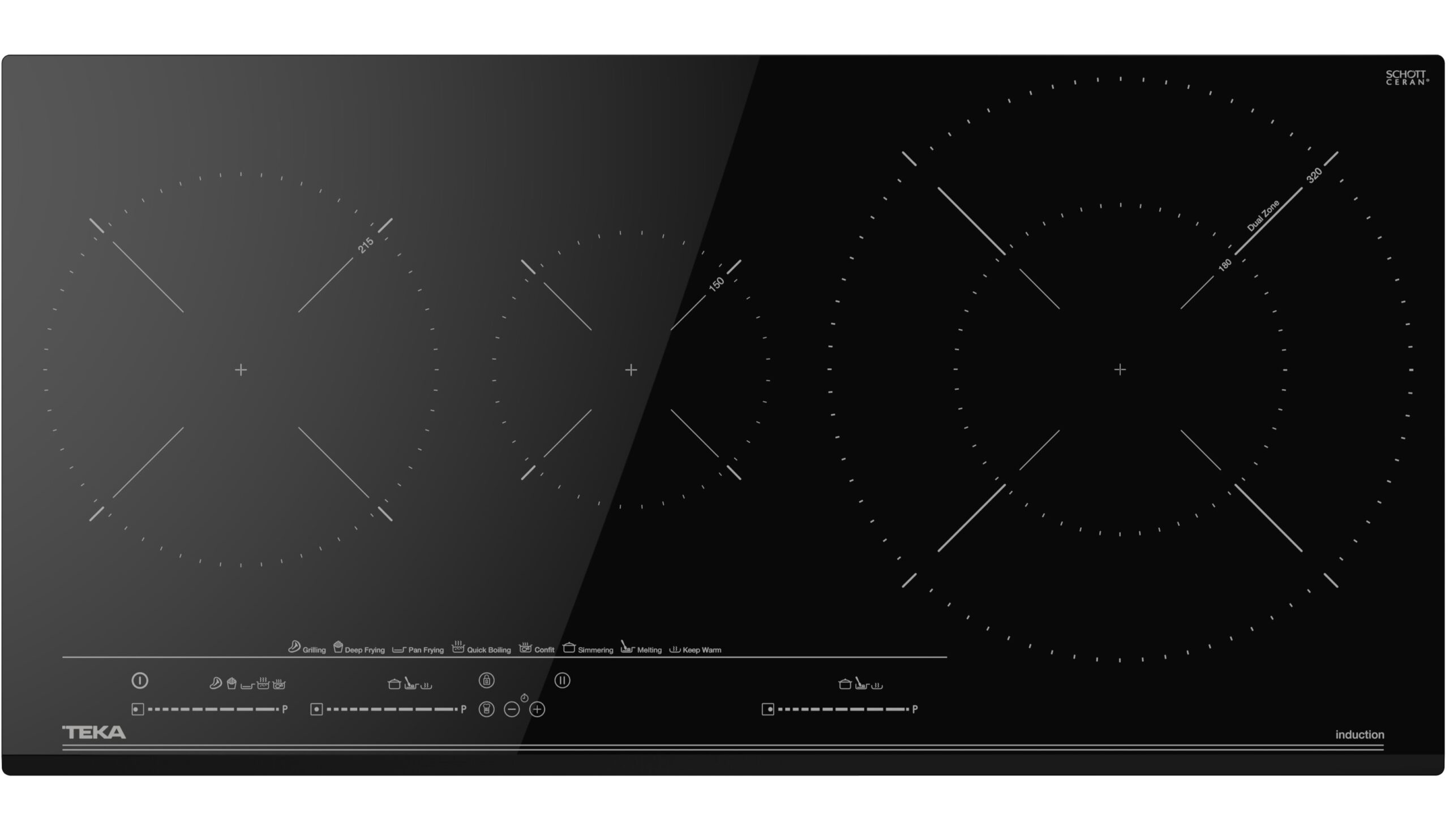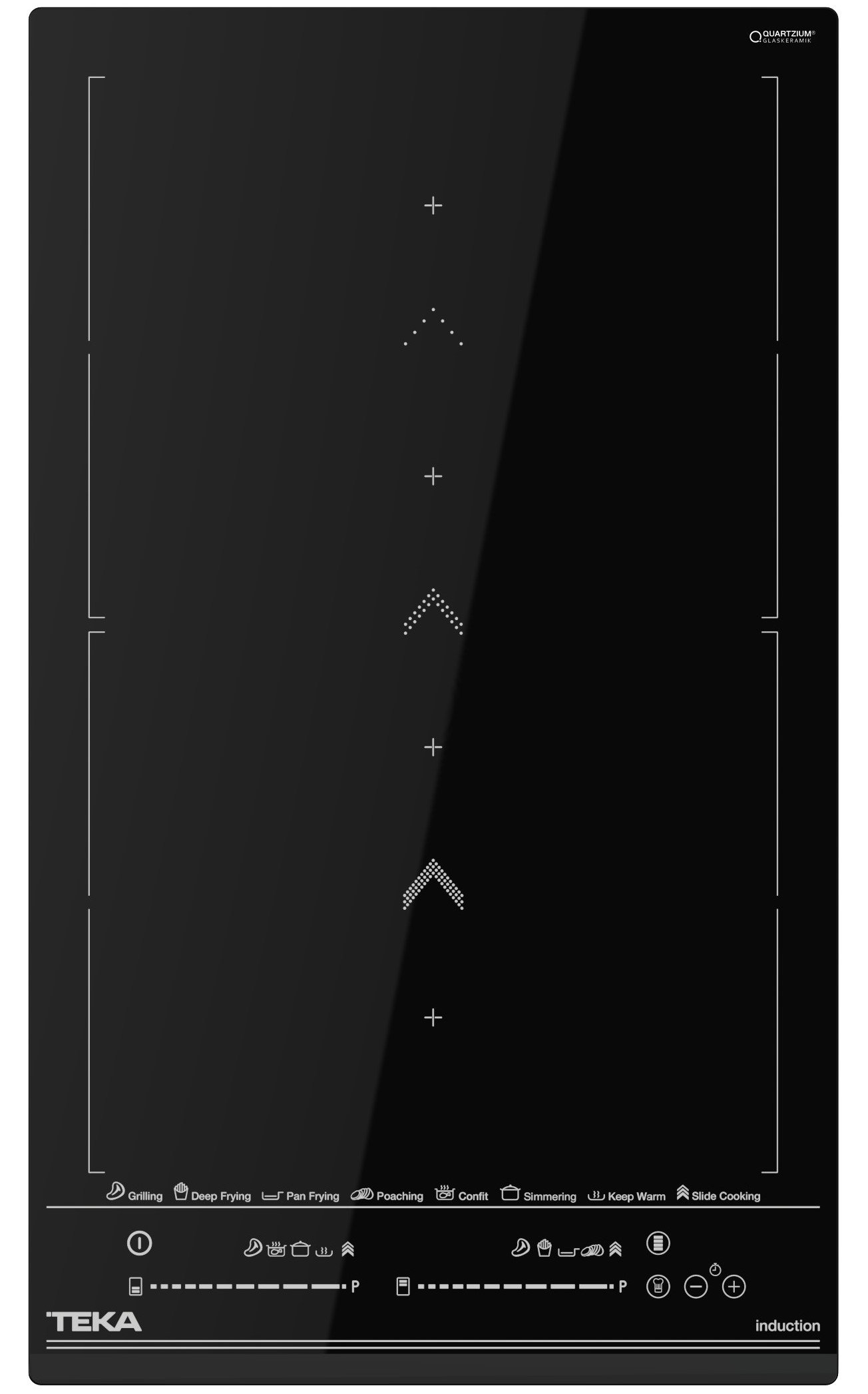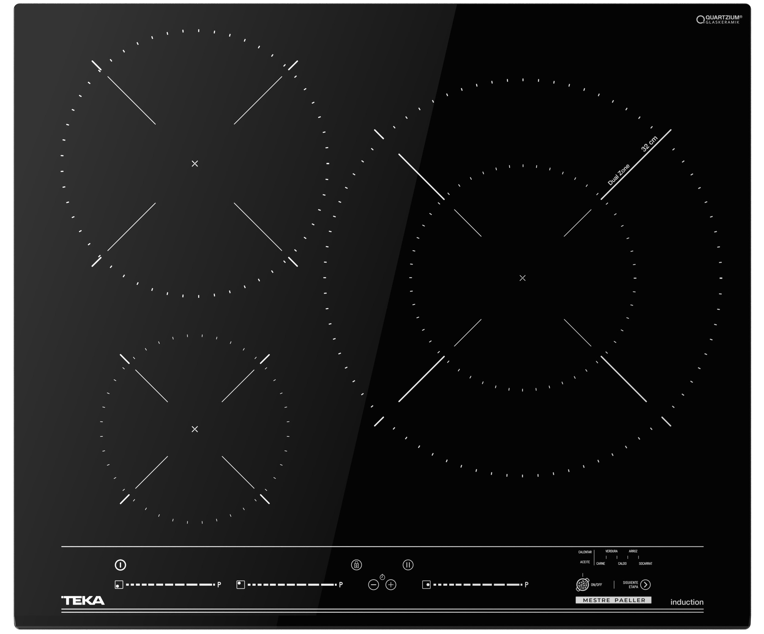Cristal con bisel frontal,Touch Control Multislider con sensores acústicos y,bloqueo de seguridad (uno para cada placa de cocción),Función Power Plus,Función STOP &, GO,Programador del tiempo d