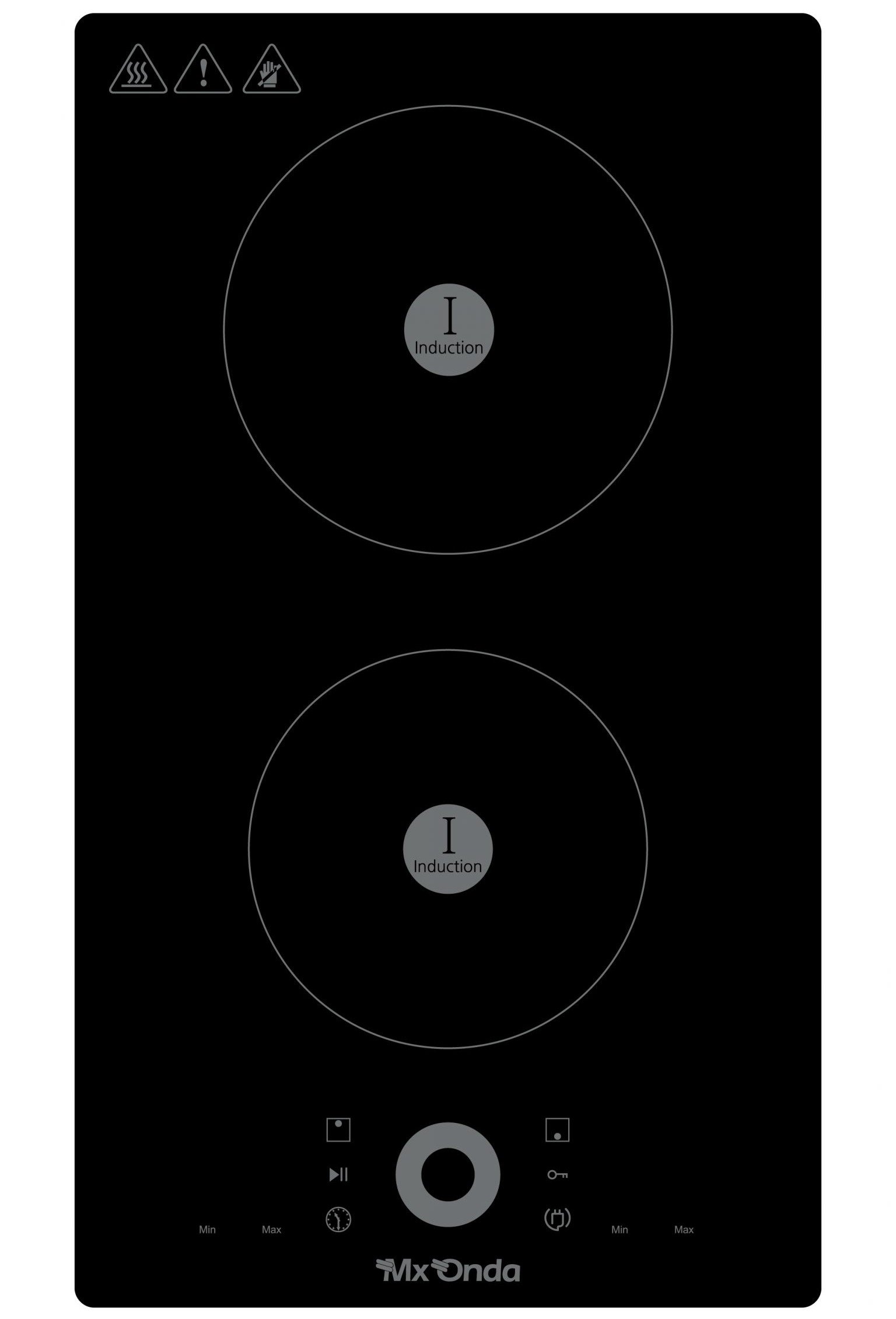 Base en acero inoxidable 304 con 0,6 mm de grosor,3 zonas de cocción,Auxiliar: para recipientes de 10 a 14 cm diámetro / Poder calorífico: 1 Kw,Semi rápido: para recipientes de 16 a 20cm diámetro