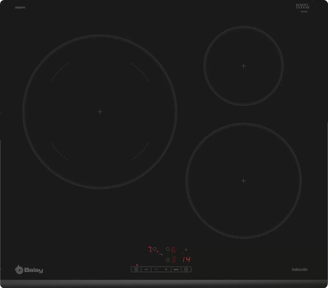 3EB865FR.,Placa de inducción de 60 cm de ancho..,Bisel delantero..,EAN: 4242006254346Control táctil de fácil uso con 17 niveles de cocción en cada zona.,.,3 zonas de inducción con función Sprint® (boost):.,- 1 zona gigante de 28 cm..,- 1 zona de 15 cm..,- 1 zona de 21 cm..,Función Inicio automático..,Función Memoria..,Programación de tiempo de cocción para cada zona..,Función Alarma con duración de aviso regulable..,Función Silencio: posibilidad de desconectar los avisos sonoros..,Función de Seguridad para niños con opción de bloqueo permanente o temporal..,Autodesconexión antiolvido de la placa..,Indicador de 2 niveles de calor residual para cada zona de cocción (H/h)..,Función Potencia máxima regulable: posibilidad de limitar la potencia total de la pla,ca..,Sistema de fácil instalación.